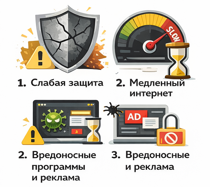 Некоторые бесплатные VPN могут внедрять рекламу или даже вредоносные программы на твой компьютер. Это может привести к заражению твоих устройств вирусами и утечке личных данных.